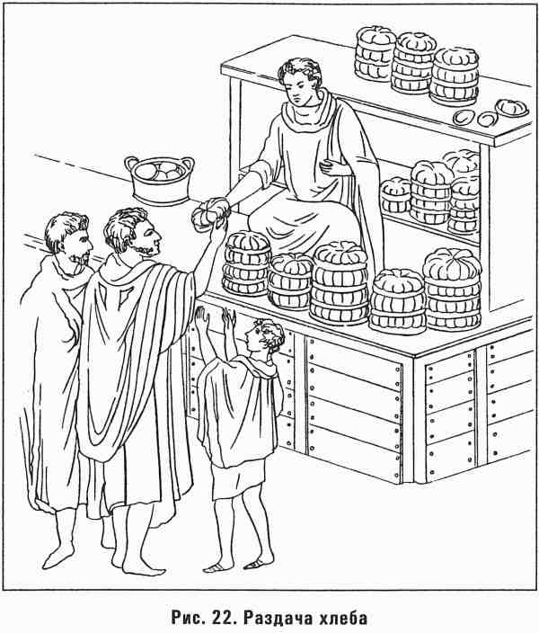Шла на форуме торговля и съестными припасами: с лотков торговали хлебом, фруктами, разными кушаньями (рис. 13). Девочка остановилась перед столиком фруктовщика; у нее разбегаются глаза, и она не знает, что ей выбрать. Тут же в трехногом котле, под которым горит огонь, разведенный в большом тазу, кипит какое-то варево; желающие могут получить его прямо «с пылу с жару». Покупатель подходит со своей посудиной, которую держит, чтобы не обжечься, на длинном крюке. Очень выразительно изображение старика-торговца (рис. 14), заснувшего над своим столиком, на котором разложена разная вкусная снедь. Мальчик тщетно протягивает плошку, требуя, чтобы он отпустил своего товара: какой-то сердобольный прохожий будит старика, толкая его пальцем в спину.