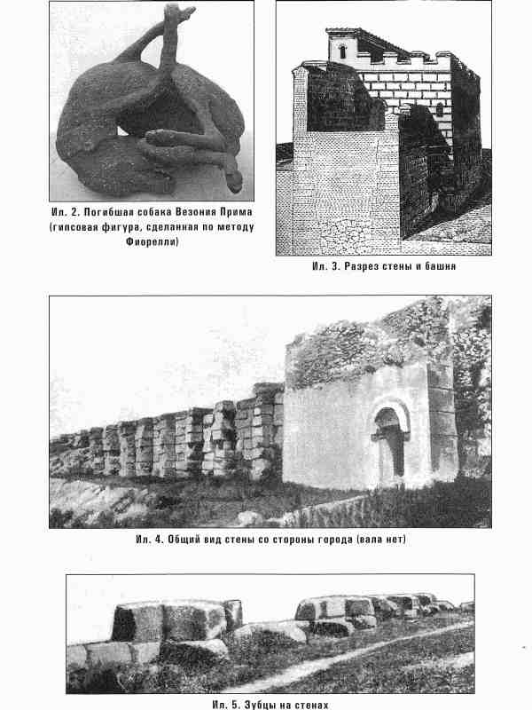 Помпеи не были залиты раскаленной лавой, как это иногда думают, и не были охвачены огнем. Случайные пожары, возникшие в некоторых местах от разожженного очага или забытой лампы, в счет не идут. Такие предметы, как дерево, хлеб, зерно сохранились в Помпеях обугленными, а не превратились в кучи золы, как это было бы неизбежно при общем пожаре. Свинец найден не расплавившимся, кости и мрамор не кальцинировались. В некоторых домах желтая охра, которой были окрашены стены, изменила свой цвет в красный: такое явление происходит действительно под влиянием жара, но опыты показали, что медленное воздействие воды приводит к такому же результату. Город был погребен под двойным слоем вулканических пород: сначала слоем в среднем до 7 м выпали «камешки» (мелкие кусочки пемзы, величиной от горошины до грецкого ореха; камни диаметром в 30 см и больше попадаются очень редко), а затем их прикрыло пеплом на 1–2 м в высоту. В некоторых местах Помпей (например, в конце улицы Изобилия, на «Новых раскопках») эти два слоя очень легко различимы.