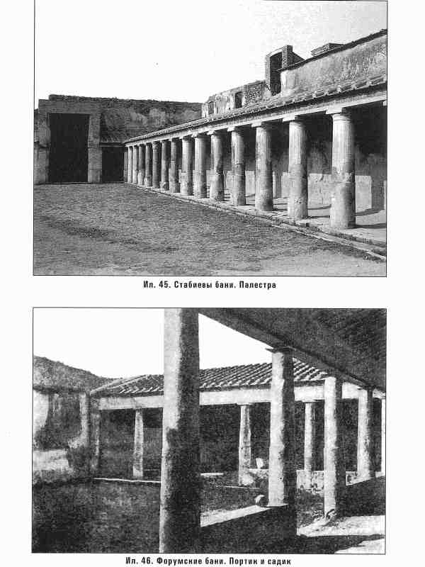 В Помпеях было несколько бань, принадлежащих частным владельцам. От них почти ничего не уцелело; зато довольно хорошо сохранились городские бани, которых в Помпеях было (ко времени гибели города) три: две вполне законченные и третья строившаяся. Самыми старыми и большими были Стабиевы (названы так потому, что выходят одной стороной на улицу, получившую в новое время название «Стабиевой»), занимавшие целый большой квартал. Выстроены они были еще во II в. до н. э., а в 80-х годах до н. э., после вывода Сулловой колонии, очевидно в связи с изменившимися потребностями и выросшим населением, несколько переделаны и отремонтированы. В то же время по распоряжению городского совета выстроили и новые бани, поменьше и попроще, к северу от форума. Археологи называют их «Форумскими» или «Малыми банями». Место для них выбрали с правильным расчетом; город был теперь как бы поделен между двумя банями: старым надлежало обслуживать преимущественно восточную и южную части города, новым — западную и северную.
