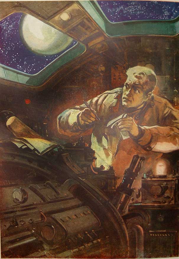 С утра 24 июля 1977 года к Тушинскому аэродрому устремились из Москвы потоки людей. И хотя старт был назначен на 21.00, уже к шести вечера толпы зрителей заполнили все пространство вокруг обширного поля, огороженного металлической изгородью. В самом центре этого поля высилась белая трубчатая башня, а внутри нее опираясь на хвост стояла ракета. Сейчас она была похожа на гигантский наконечник етрелы, в котором сама ракета занимала только небольшую часть острия. А все остальное было предназначено для старта И продолговатое тело «стрелы», и длинные скошенные под острым углом назад крылья, и расположенные на них мощные стартовые двигатели — все это должно было отпасть и опуститься на парашютах, как только будет набрана достаточная скорость. Развешенные повсюду на столбах алюминиевые репродукторы-»колокольчики» повторяли зрителям пояснения радиодиктора: — Сегодня будет дан старт первому в истории человечества межпланетному кораблю, который поведет в пространство не радиолуч, а человек. Корабль облетит вокруг Марса, выполнит подробную съемку этой планеты с близкого расстояния и, не производя посадки, вернется обратно на Землю ровно через год, 24 июля 1978 года Право вести ракету правительство предоставило руководителю группы конструкторов Андрею Петровичу Ильину. Ракета оторвется от Земли с помощью стартовых жидкостно-реактивных двигателей. За пределами атмосферы начнет работать атомно-реактивный двигатель межпланетного корабля. В нем за счет энергии урана будет нагреваться аммиак. Раскаленные газы с температурой в несколько тысяч градусов, вытекая через дюзы, будут толкать ракету в противоположном направлении. Следует сказать, что запасы жидкого аммиака составляют 89 процентов взлетного веса корабля, а корпус, баки, двигатель кабина, инструменты и жизненные припасы — только 11 процентов. Зрители слушали со вниманием. Сквозь толпу, как влага через фильтр, просачивались мальчишки и собирались у изгороди. Изгородь, а также дорога, ведущая к стартовой башне, были густо оцеплены милицией. И это была очень разумная мера. День старта вообще был тяжел для милиции. Начальник Тушинского отделения, охрипший и распаренный, жаловался по телефону: — Я бы, понимаешь, этих научно-фантастических авторов привлекал бы согласно Уголовного кодекса. Портят юношество, понимаешь. Что ни повесть, или роман, у них там обязательно заяц. На Марс ли, понимаешь, под воду, или там, как говорится, в недра Земли — везде у этих авторов заяц. Да еще к тому же и пионер. Для развлекательности, чтобы ей пусто было. И что мы теперь имеем по ведомости на сегодняшний день? С электропоездов, с самолетов, автомашин и прочего транспорта, прибывающего в Москву, снято зайцев — 18 650, при попытке проникнуть через загородку к ракете задержано 785 Одного, понимаешь, из дюзы вытащили. Лет 12, в коротеньких штанишках, в портфеле — компас, термос и две булочки. В космос, понимаешь, собрался «Ты, — говорю, — дурачок куда пoлeз? Ведь сгорел бы.» Молчит, плачет. Просто бедствие. Между тем в небольшом домике, на краю аэродрома, шли последние приготовления. В одной из комнат лежал, полузакрыв глаза, сам Андрей Петрович Ильин — невысокий, худощавый и черноволосый человек. В комнату заглянул председатель стартовой --">- 1