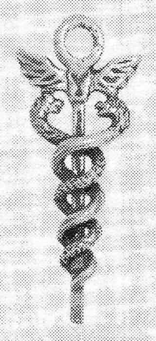 КАДУЦЕЙ — атрибут Оздоровителя, бога Древней Месопотамии (2600 г. до н. э.), излечивающего все болезни. В античной символике — жезл бога торговли Меркурия. Восходящие змеиные энергии порождают вихрь энергии, преображающий всего человека. Крылья над палицей — символ воздуха и освобождения от дурных привычек.