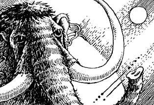 — Борисе! Та прокинься ти, чуєш? Спальний мішок засовався на ялицевій постилці, розтягнувся, як величезний кокон. — Жодної собаки! — термосив Василь товариша. — Всі пощезли… Кокон знов заворушився, з’явилася голова Бориса, заспані очі-щілинки. — А мені снилося… море, — сказав він. — Таке синє… — Жодної!.. — хвилювався Василь. — Як вітром здуло! — Куди? — запитав Борис. — Якби знав — не запитував!.. Борис сів, витягнув звідкілясь шапку, насунув на голову: мороз — двадцятиградусний. — Повтікали? — запитав, байдуже позіхаючи. — А море, ох і синє ж! — Потягнувся так, що аж затріскотіли суглоби. Василь вилаявся спересердя: — Ти прочумаєшся чи ні? Ранок розгорявся у туманах. Рожеве світло лягало на гладінь засніженої ріки, торкалося віддалених вершин пагорбів і губилося над обрієм у безодні зникаючої ночі. Ріка повертала на північ, круглилася закрутом, розсувала тайгу. Все було чисте, біле; дивно чорніли на білому двоє нарт, згарище від багаття. І довкола — ні звуку. Це вплинуло на Бориса більше, ніж слова і штурханці Василя. Зірвавшись на ноги, він закричав: — Рустан, Рустан! Салка! Крик полинув над рікою, слабо відбився від берегових круч. — Куди ж вони поділися?.. — Борис озирався навсебіч. Сліди собачих лап, покружлявши коло багаття, тягнулися до берега, у закрут. Борис з Василем помчали по сліду. Це була непогана розминка, свого роду зарядка. І мороз підганяв добряче. Та головне — чому і як далеко втекли собаки? Засапавшись, друзі обігнули мис, що круто заходив у ріку, і зупинилися. Зграя була тут. Напередодні увечері Борис і Василь підірвали на березі схил, що зсунувся униз. Тут же хотіли залишитися на ніч, щоб уранці приступити до проб, однак брила нависала так загрозливо, що друзі вирішили не ризикувати і пошукати для ночівлі зручніше місце. І вчинили правильно: брила відвалилася і на висоті чотирьох-п’яти метрів відкрила вузьку щілину. Собаки пірнали у щілину й поверталися звідти із здобиччю. Тут же, поміж каменів, пожирали шматки. Угледівши Бориса і Василя, підлабузницьки завертіли хвостами: мовляв, ми нікуди не втікали, всі тут і загалом непогано поснідали. — Рустан! Салка! — покликав Борис. — До мене! Вожаки відокремилися від зграї, рушили; за ними потягнулися інші, облизуючи закривавлені пащі. — Що ви знайшли? Яку мерзоту? — з огидою запитував Борис. Ситі звірі повискували, відчуваючи, що у голосі людей немає погрози, пробували потертися мордами об унти Бориса і Василя. Ті позадкували: пащі собак були в крові до самих очей, обліплені бурою шерстю; довкола валялися шматки шкіри, переплутані жмути жовтої з чорнотою гриви. Переборюючи відразу, Василь нахилився над погризеним шматком: — Борисе!.. Той розглядав клаптик шкіри, і, коли звів очі, в них були подив і запитання: — Не второпаю. — Це неймовірно, Борисе! Мамонт!.. Обидва, як по команді, звели погляд на зяючу щілину. Гостровуха лайка прошмигувала туди, злодійкувато роззираючись. — Румка! — загорлав Борис. — Куш! Собака забралася геть, інші відскочили від людей на кілька кроків. Поки Борис відганяв собак, Василь видряпувався по каменях до отвору. Товариш наздогнав його біля самої діромахи, і те, що відкрилося їхнім очам, глибоко приголомшило обох. У чорній порожнечі вимальовувався бік велетенської тварини. Бура шерсть висіла жмутками, як змертвіла кедрова глиця. Частину шкіри і м’яса бул