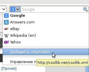 Появилась возможность добавить поиск книг по библиотеке КулЛиб в меню панели поиска вашего браузера. Работает с браузерами: Internet Explorer, Mozilla Firefox, Iceweasel (Mozilla для linux).
